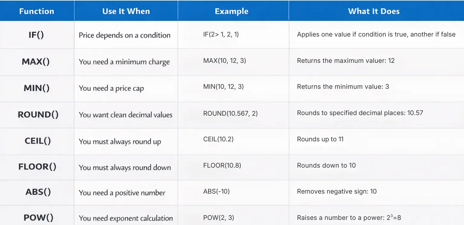 These functions help you control how numbers behave in your pricing logic. Combine them with operators and dynamic values to build precise and flexible calculations.