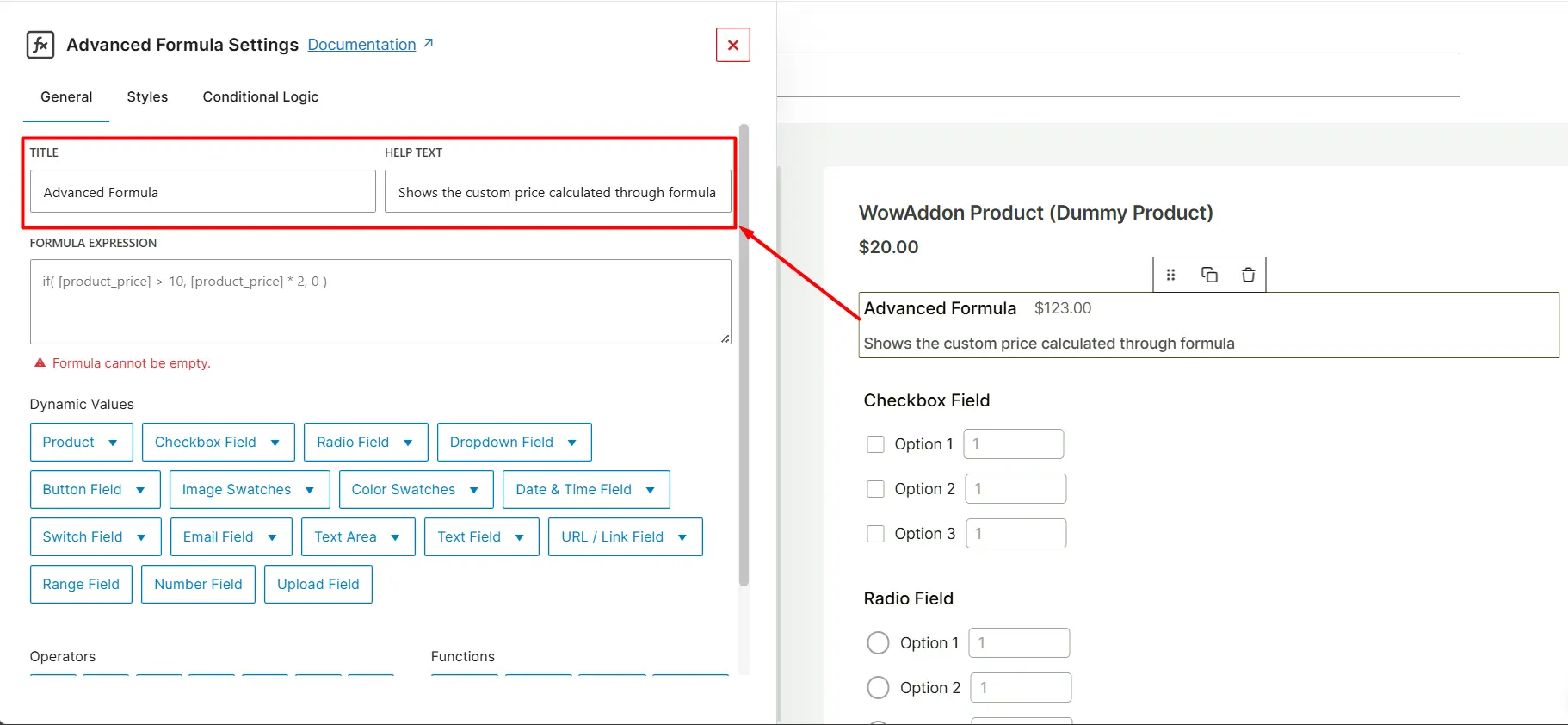 This is the most vital section of WowAddons’ Advanced Formula field. This field integrates with 15 other WowAddons fields.
